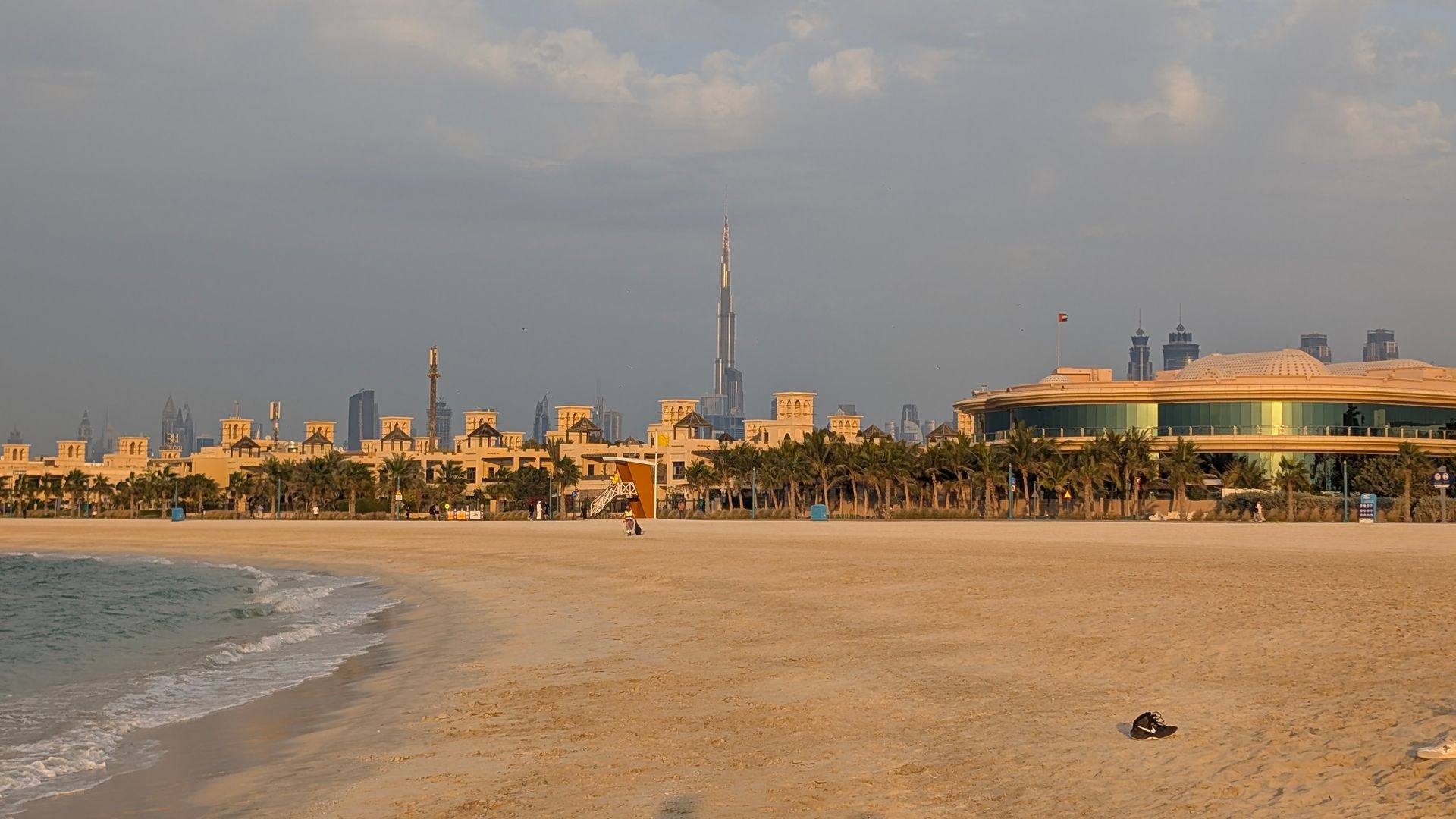 Die goldene Stunde - das Licht, das Meer, die Kitesurfer und die Skyline Dubais im Hintergrund -